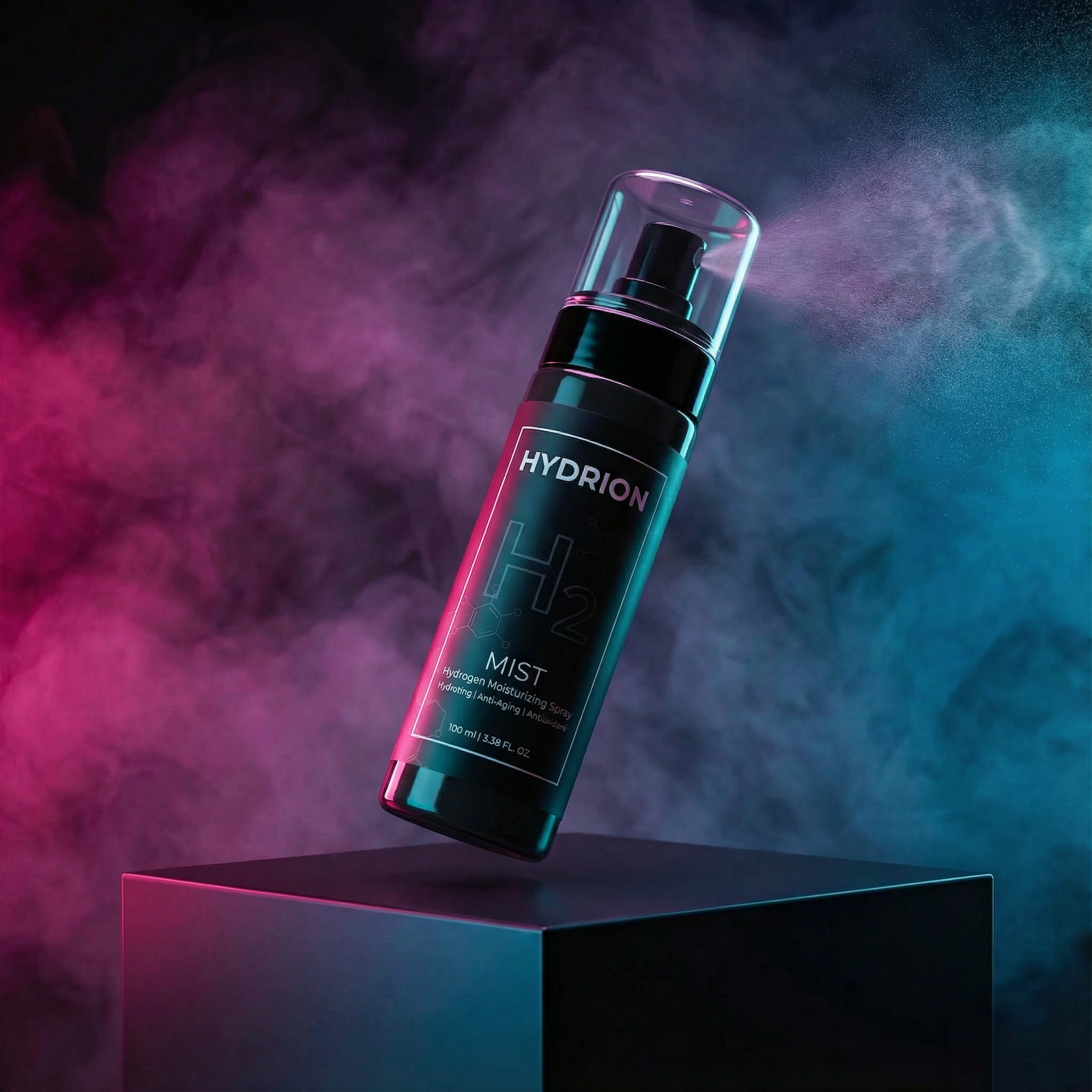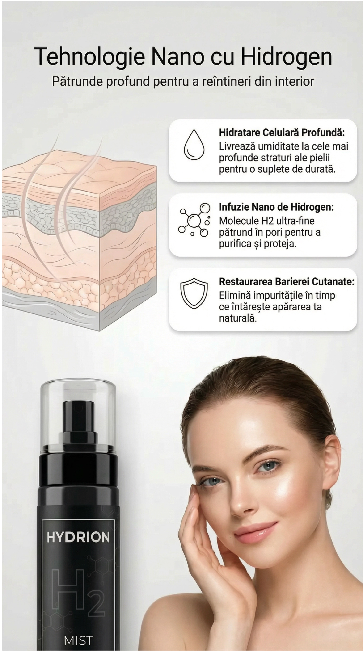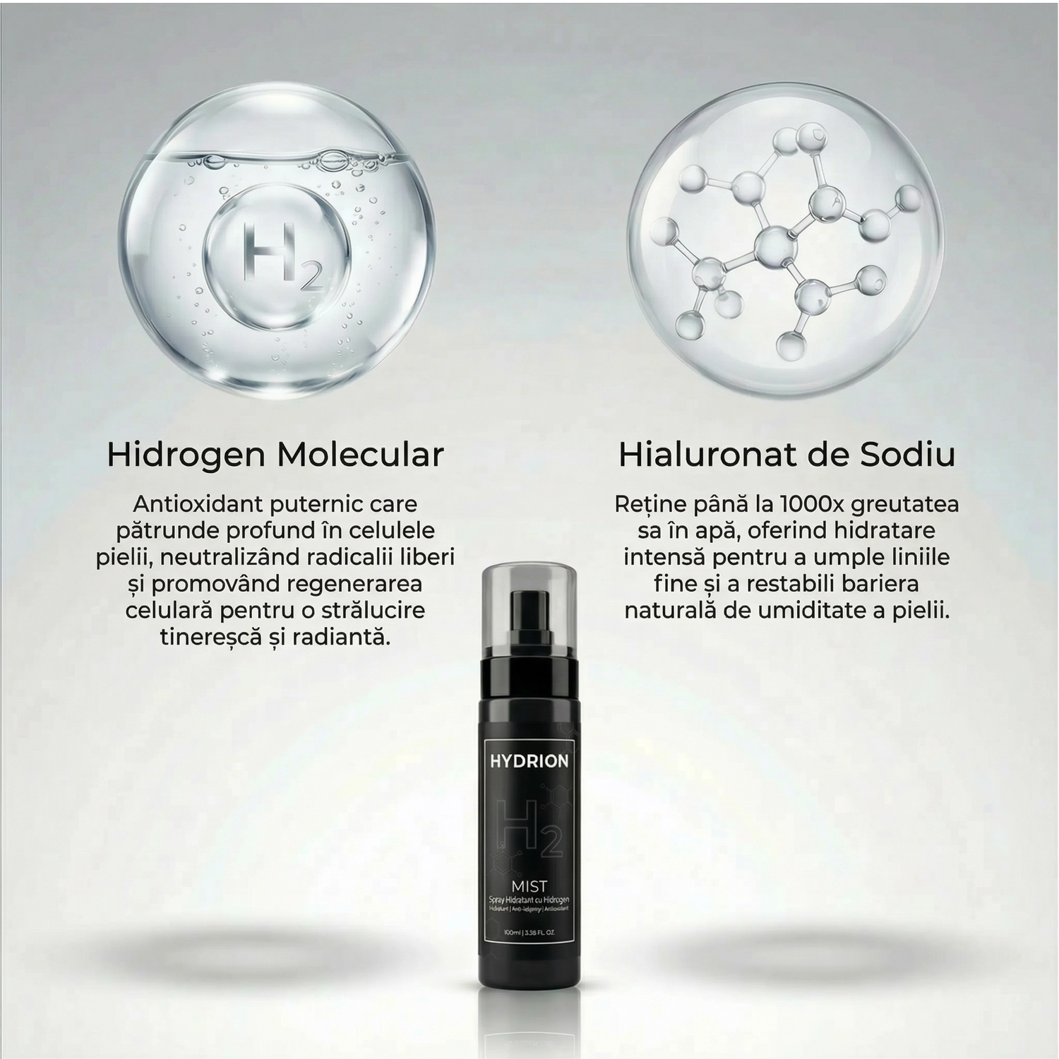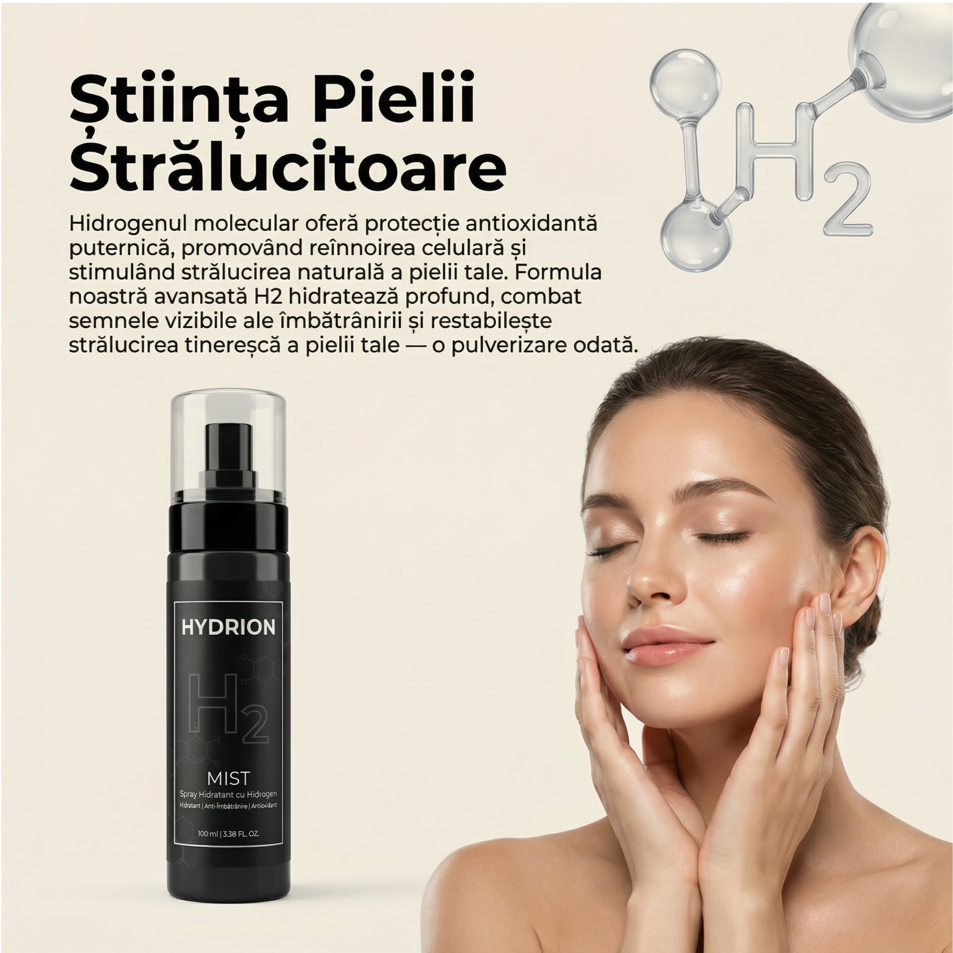 Hydrion Mist este un spray facial infuzat cu hidrogen care livrează hidrogen molecular (H₂) direct pe pielea ta. Hidrogenul este cea mai mică moleculă existentă — penetrează celulele pielii instant pentru a neutraliza radicalii liberi, reduce stresul oxidativ și susține regenerarea celulară. Spre deosebire de antioxidanții tradiționali care sunt prea mari pentru a penetra profund, hidrogenul ajunge la piele la nivel celular, acolo unde îmbătrânirea se produce cu adevărat.